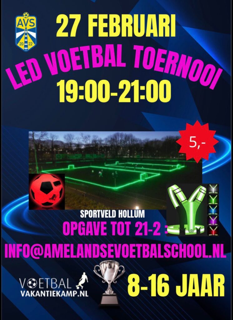 HOLLUM – Tijdens de voorjaarsvakantie organiseert de Amelandse Voetbalschool (AVS) iets unieks: het allereerste LED-voetbaltoernooi op Ameland. Kinderen krijgen de kans om te voetballen op een veld dat verlicht is met LED-verlichting, terwijl ze spelen met een lichtgevende bal en hesjes.