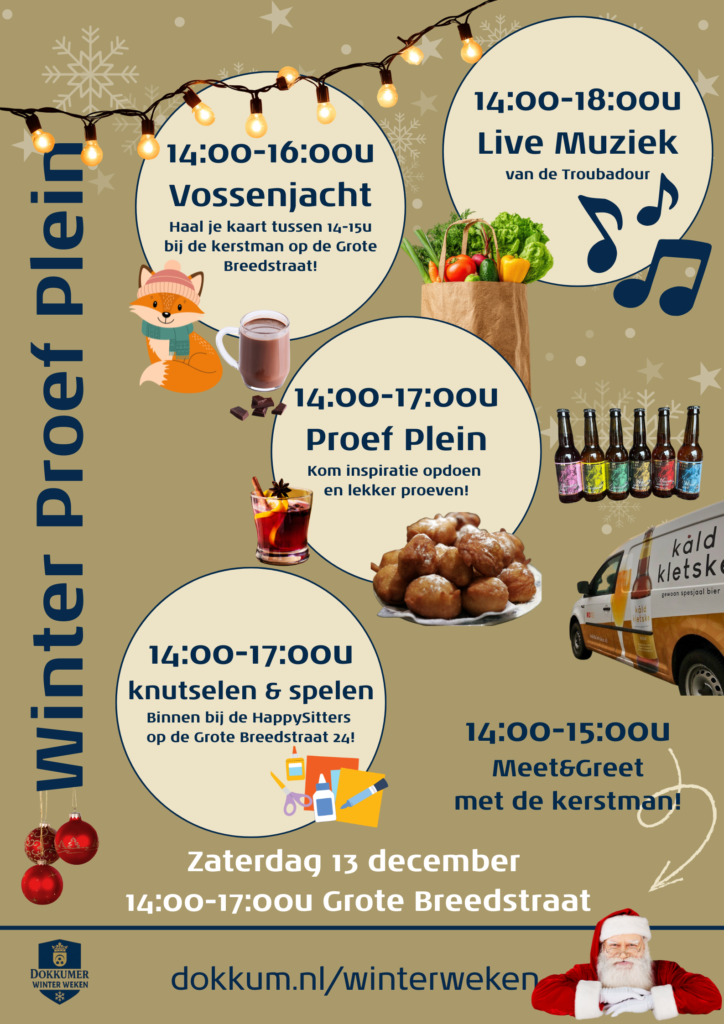 Na deze succesvolle start, staat het volgende evenement van de Winter Weken op de agenda: op zaterdagmiddag 13 december, de dag na de kerstfair, wordt de Grote Breedstraat omgetoverd tot een Winter Proef Plein. Een winters tafereel vol streekproducten, livemuziek, lichtjes, lekkernijen en inspiratie voor de feestdagen. “Het Winter Proef Plein is dé plek om lokale smaken te ontdekken, ideeën op te doen voor het kerstdiner en te genieten van winterse gezelligheid in de binnenstad,” aldus de werkgroep. “Voor kinderen is er een speciale ruimte ingericht waar ze binnen lekker kunnen spelen en knutselen met de (oppas)meiden van de Happysitters. Tussen 14:00 en 15:00 uur deelt de Kerstman vossenjachtkaarten uit: tussen 14:00 en 16:00 uur wandelen tien Winterse Vossen door het winkelgebied. Vind je alle tien vossen? Dan verdien je een lekker bekertje warme chocolademelk! Uiteraard zijn alle winkels open, zodat de laatste kerstinkopen lokaal gedaan kunnen worden. We hopen dat veel Dokkumers én bezoekers de weg naar Dokkum weten te vinden. En zo, aansluitend op de Kerstfair, een heerlijk weekend beleven!”