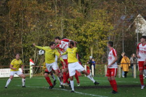 Fotobijschrift: Op spectaculaire wijze scoort Pieter Kiewiet in de voorlaatste minuut, maar zijn doelpunt wordt afgekeurd.