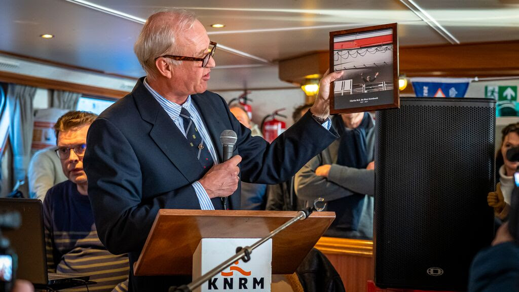 Schenker Nanne de Boer ligt in zijn toespraak de achtergrond toe van de schenking van de nieuwe reddingboot Clarita. Fotograaf Martijn Bustin.