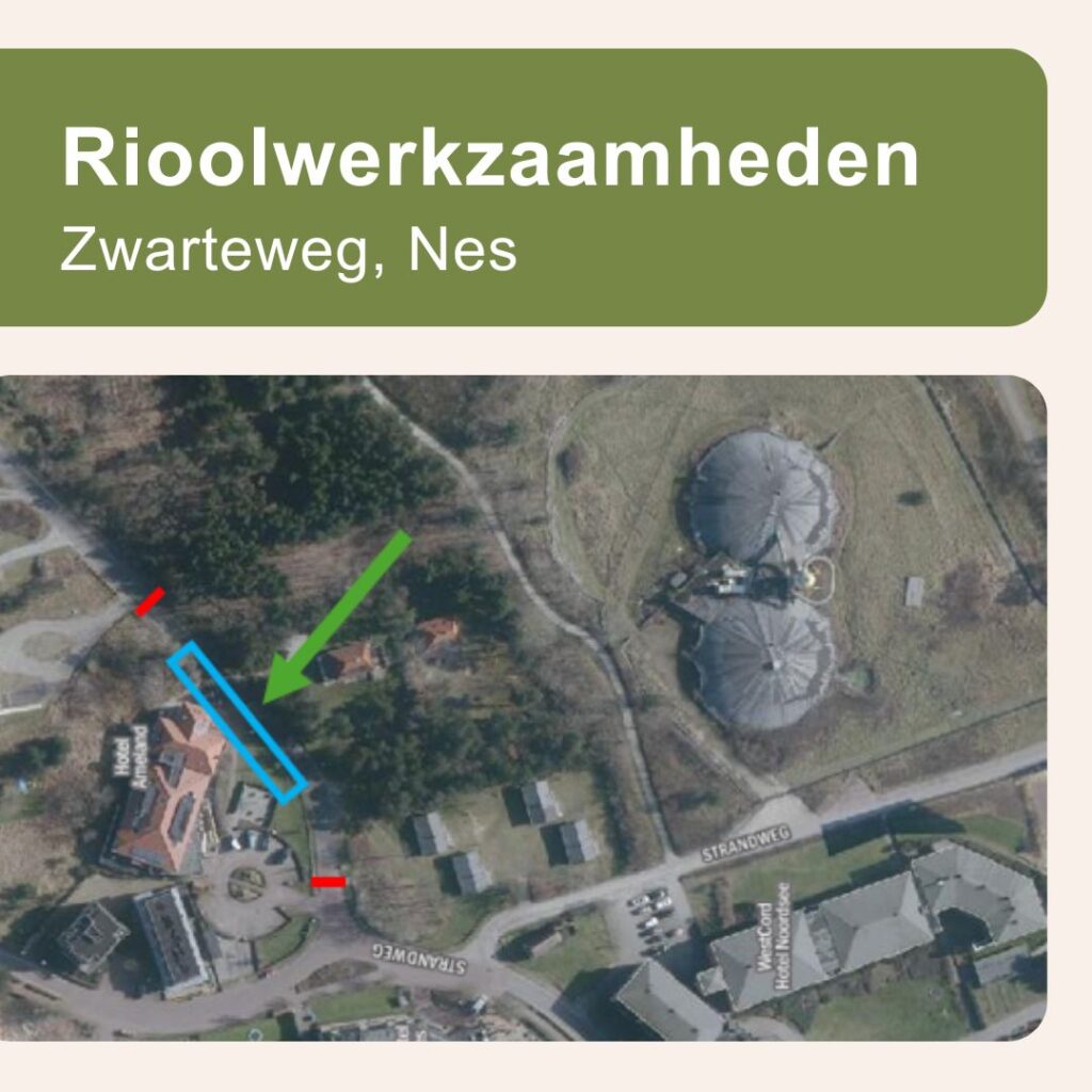 NES – Van donderdag 20 november t/m 5 december vinden aan de Zwarteweg in Nes, nabij Hotel Ameland, rioolwerkzaamheden plaats. De weg blijft in deze periode grotendeels toegankelijk.