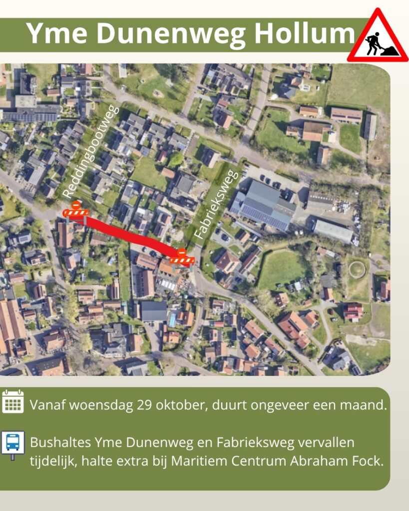 De Yme Dunenweg is vanaf dinsdag 29 oktober afgesloten voor verkeer. Tijdens de werkzaamheden komt er een opstelplaats voor de bus. Het verkeer wordt omgeleid. De bushaltes Fabrieksweg en Yme Dunenweg vervallen tijdelijk. Er komt een extra halte bij het Maritiem Centrum Abraham Fock.