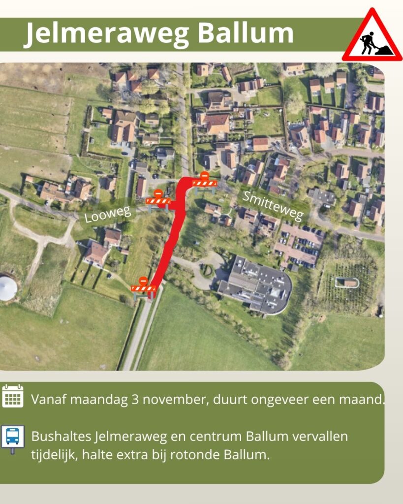 De Jelmeraweg wordt vanaf maandag 3 november afgesloten. De weg krijgt een nieuwe inrichting, waaronder een versmalling. Ook hier wordt het verkeer omgeleid. De bushaltes Jelmeraweg en Centrum Ballum vervallen tijdelijk. Een extra bushalte wordt ingericht bij de rotonde in Ballum.